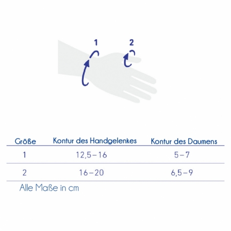 Die Größe richtet sich nach dem Umfang des Daumens und des Handgelenks in Zentimetern, wie auf dem Bild zu sehen.