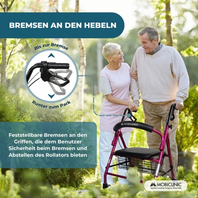 Die Griffe des Gehhilfen mit Sitz sind ergonomisch geformt und tragen dazu bei, das Gewicht zu verteilen und abzufedern und Ermüdungserscheinungen beim Gebrauch zu reduzieren. Darüber hinaus verfügen sie über sanft aktivierte Bremsen, um den Gehwagen genau im gewünschten Moment und ohne Kraftaufwand anzuhalten. Darüber hinaus besteht die Möglichkeit, sie arretiert zu lassen, um die Immobilisierung des Gehwagens beispielsweise beim Sitzen auf dem Sitz zu gewährleisten. Wenn Sie den Gehwagen vollständig blockieren müssen, müssen Sie die Bremshebel nach unten ziehen und die Räder werden blockiert.
