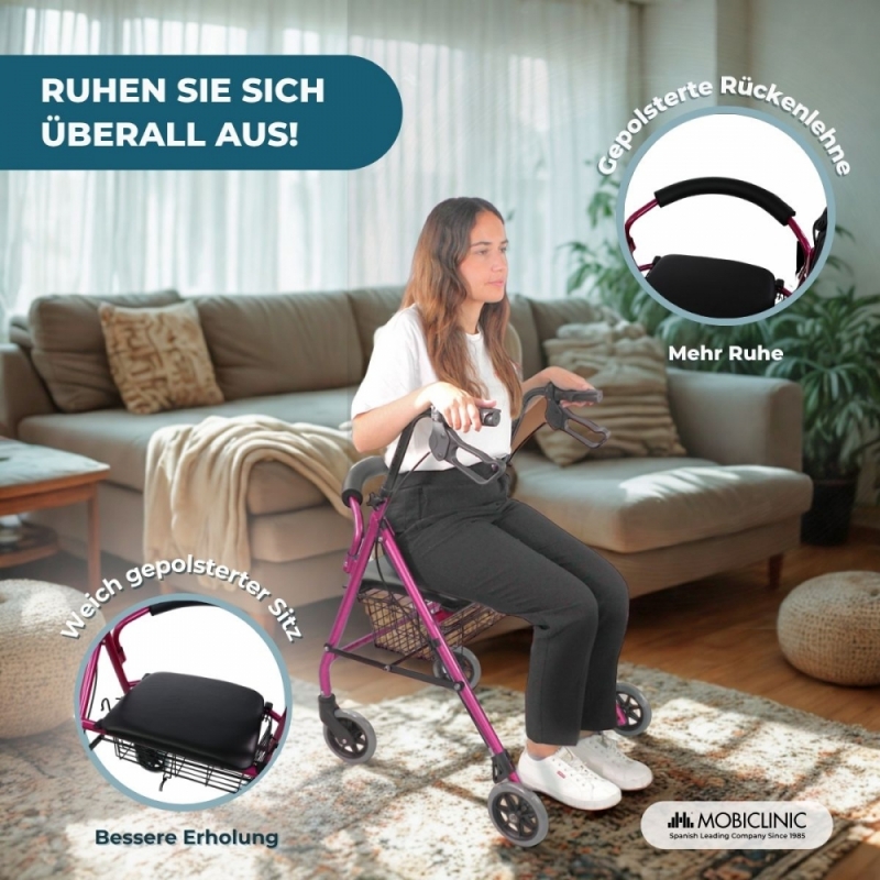 Dieser Aluminium-Gehwagen verfügt über einen gepolsterten Sitz und eine gepolsterte Rückenlehne, um Komfort und Sicherheit sowie ausreichend Ruhe nach der Anstrengung zu gewährleisten. Enthält einen Korb, in dem Gegenstände beim Gehen sicher und bequem aufbewahrt werden können. Sie können es sowohl unter dem Sitz als auch vorne am Gehwagen positionieren.