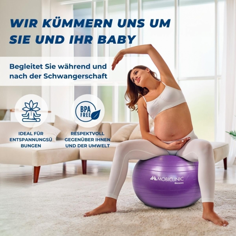 SCHWANGERSCHAFTSBALL : Ebenso wird er derzeit häufig als Geburtsball in allen Phasen der Mutterschaft verwendet . Es kann vor der Geburt verwendet werden, um Beweglichkeitsübungen im Becken durchzuführen, während der Geburt, um eine Haltung beizubehalten, die es Ihnen ermöglicht, Ihre Beine auf die richtige Art und Weise zu beugen, um den Kanal zu öffnen, ohne die Gelenke zu überlasten, und in der Zeit nach der Geburt zur Erholung und Erholung wieder in Form.