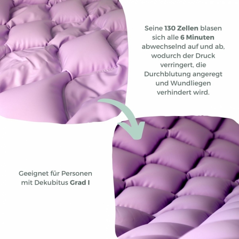 Seine 130 einzelnen Zellen werden abwechselnd für 6 Minuten aufgeblasen und entleert und auf diese Weise erhält der Patient eine konstante Druckentlastung . Dieser Druck, der durch alternierende Zellen über die Struktur verteilt wird, aktiviert die Durchblutung und beugt der Bildung von Wundliegen vor.