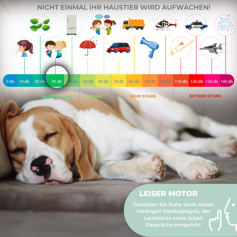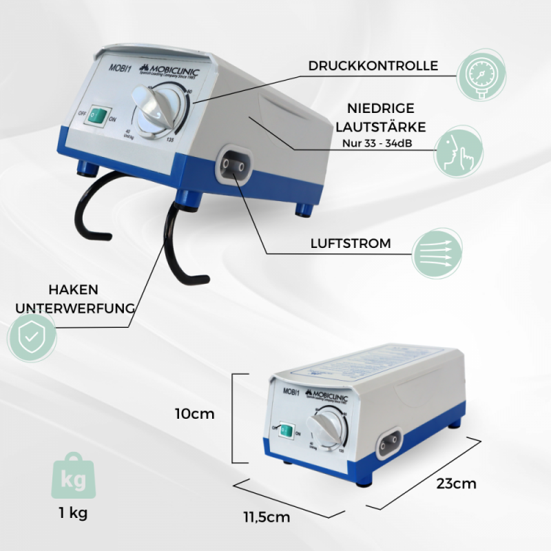 Des Weiteren ist auch der Anti-Dekubitus-Matratzenkompressor kompakt, zuverlässig, einfach zu bedienen und sehr leise , die Lautstärke entspricht einem leisen Gespräch.