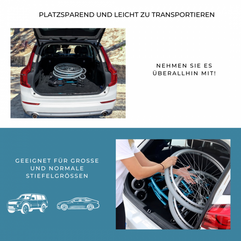 ABNEHMBARE HINTERRÄDER: Dank des Schnellverschlusssystems können Sie die Hinterräder per Knopfdruck abnehmen, sodass Sie den Stuhl und die Räder problemlos separat in jedem Auto transportieren können.