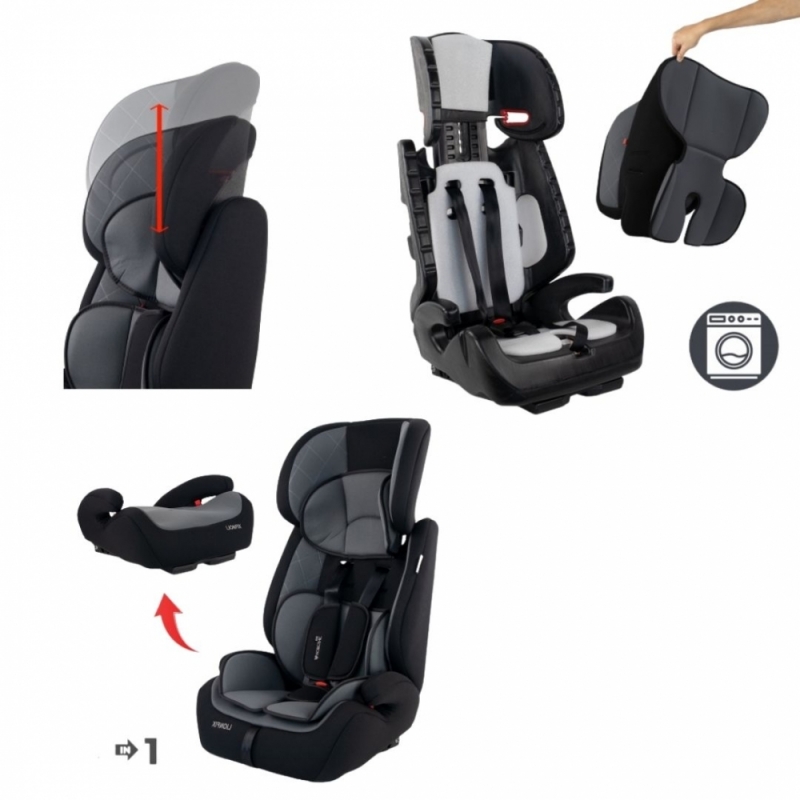 - Isofix-Autositz: zugelassener und faltbarer Autositz mit verstellbarer Kopfstütze, abnehmbarer Rückenlehne und 5-Punkt-Gurt, der das Kind festhält.