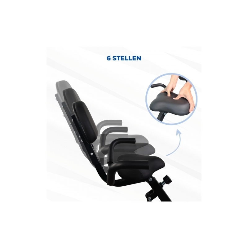 Dieses Modell verfügt über ein ergonomisches Design, das sich in der gepolsterten und verstellbaren Sitzfläche und Rückenlehne widerspiegelt. Der Sitz lässt sich in zwei Positionen von 76 bis 89 cm verstellen, sodass er auf verschiedene Höhen eingestellt werden kann und der Benutzer dabei hilft, die beste für das Training erforderliche Haltung zu finden. Die seitlichen Griffe sorgen außerdem für eine korrekte Körperhaltung und sorgen für Stabilität, die Ihr Training komfortabler und sicherer macht.