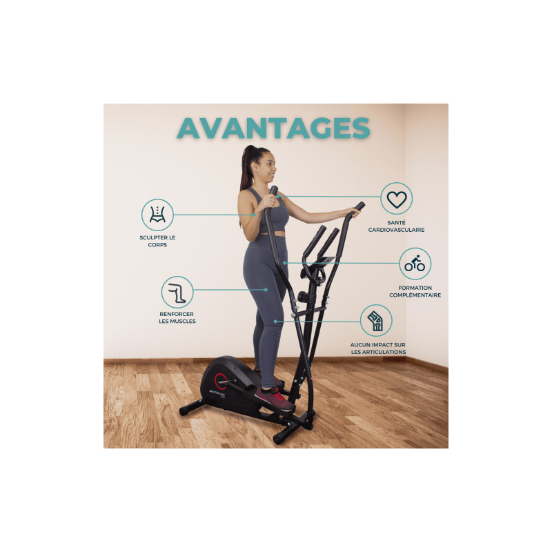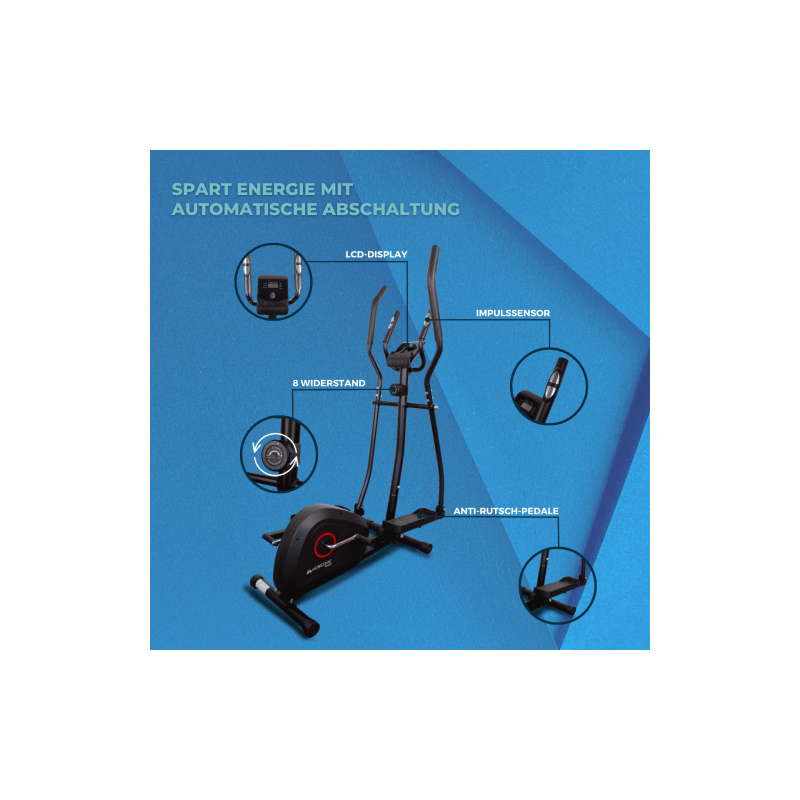 Das Ellipsentrainer ATLAS wurde für Benutzer mit Einsteigerniveau entwickelt, da es durch die 8 Widerstände eine progressive Übung ermöglicht, wodurch sich das Gerät an Ihre Ziele und Ihre körperliche Verfassung anpasst. Darüber hinaus können Sie dank des integrierten LCD-Bildschirms die Entwicklung Ihres Trainings verfolgen: Sie können die Geschwindigkeit, die Zeit, die zurückgelegte Strecke, die verlorenen Kalorien und den Puls messen.