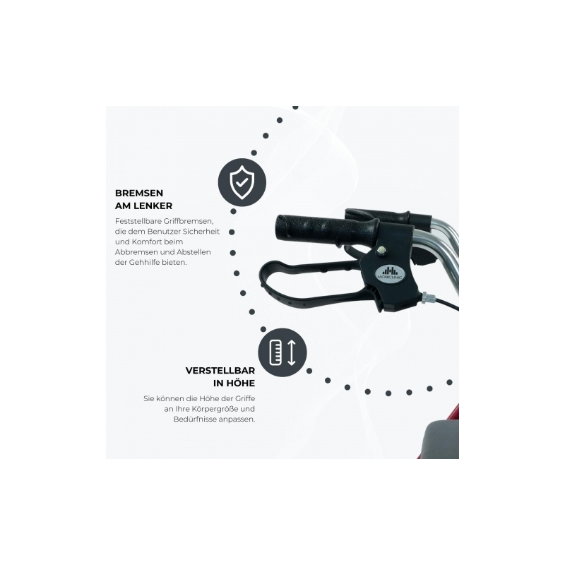 SICHERER: Dank der Bremsen, die denen eines Fahrrads ähneln, können Sie den Gehwagen mit Rädern und Sitz jederzeit anhalten. Wenn der Gehwagen vollständig stillgelegt werden muss, müssen die Bremshebel nach unten gezogen werden und die Räder werden blockiert. Zum Entriegeln müssen Sie die Griffe nach oben ziehen.