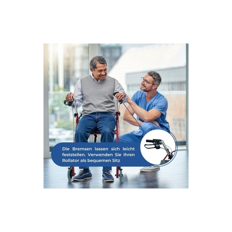 Sein ergonomischer Griff, der die Ermüdung während des Gebrauchs verringert, verfügt über sanfte Aktivierungsbremsen, um den Gehhilfe für ältere Menschen genau im gewünschten Moment und ohne Kraftaufwand anzuhalten. Sie haben auch die Möglichkeit, die Bremsen arretiert zu lassen, um die Immobilisierung des Gehwagens beim Sitzen oder Anlehnen zu gewährleisten.