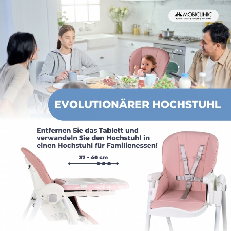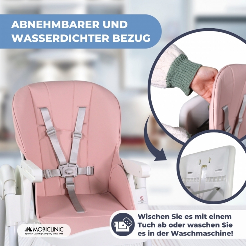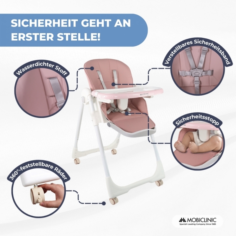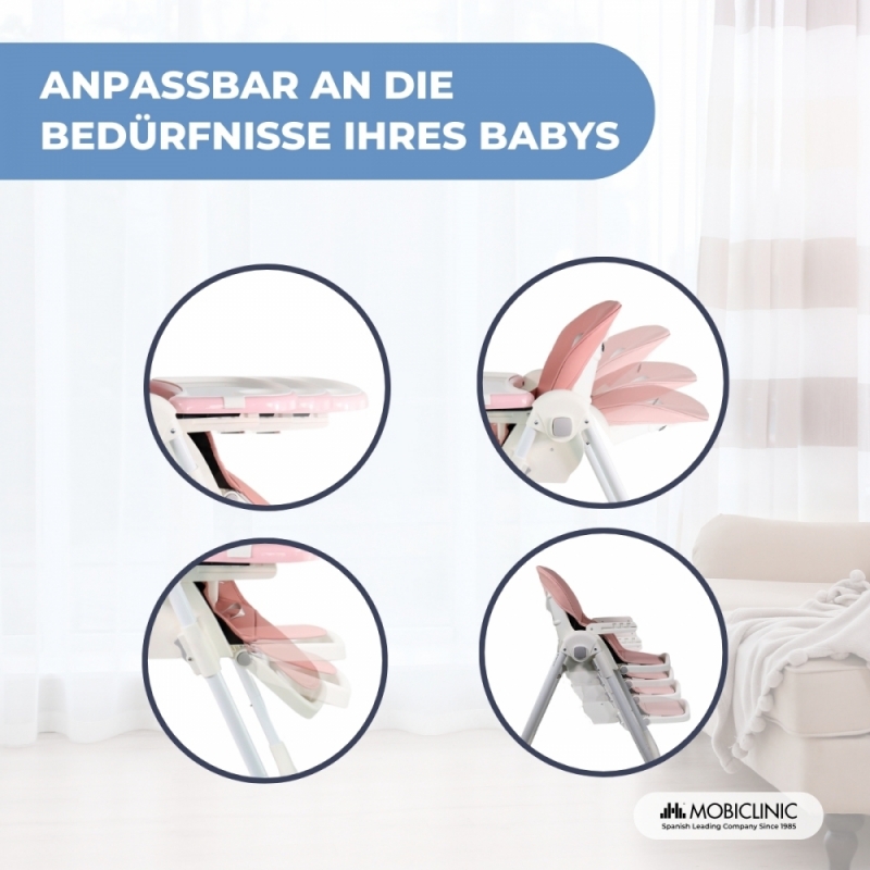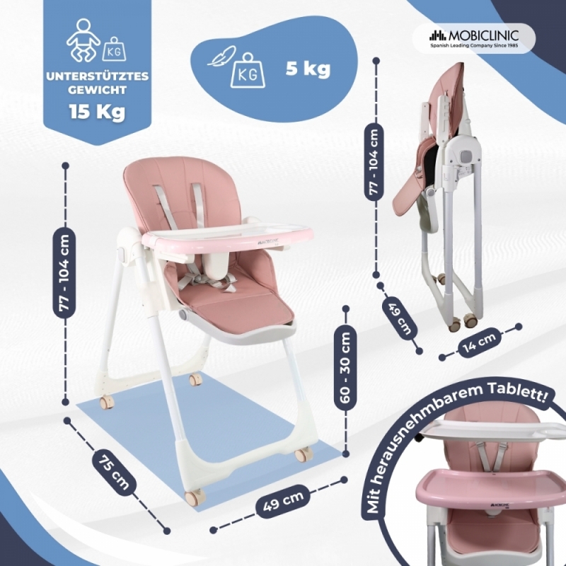 Dieses vollständig faltbare und vielseitige Modell nimmt nur wenig Platz ein und verfügt über Räder mit Bremsen für einen besseren und bequemeren Transport. Dank seines Designs bietet es eine Vielzahl von Möglichkeiten als Sitz, so dass das Kind nach und nach an den Tisch herankommt und z. B. den Umgang mit dem Besteck lernt.
