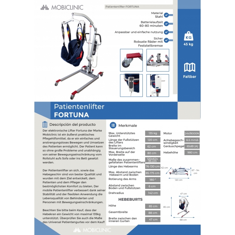 LEISTUNG: Der Fortuna Patientenlifter verfügt über einen 24V/8000N Motor. Die Batterielaufzeit ermöglicht einen Betrieb von 60-80 Minuten. Das Gesamtgewicht des Patientenlifters beträgt 45 kg. Die maximale Traglast beträgt 180 kg. Die Hubstrecke dieses orthopädischen Lifters beträgt 91 cm bei einer Geschwindigkeit von 6,5 mm/s. Der Wenderadius beträgt 142 cm. Der Arm ist um 180° drehbar.