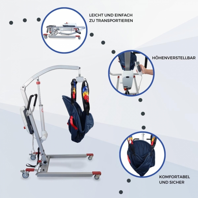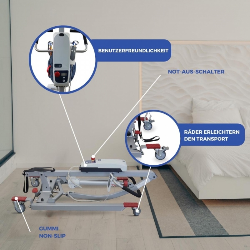 SICHERHEIT: Reduziert das Verletzungs- und Sturzrisiko für Patient und Pflegekraft. Der Hebebügel ermöglicht es, den Patienten während des Transfers zu halten und so für Stabilität zu sorgen. Ein Not-Aus-Schalter ermöglicht das manuelle Anheben und Absenken des Patienten.