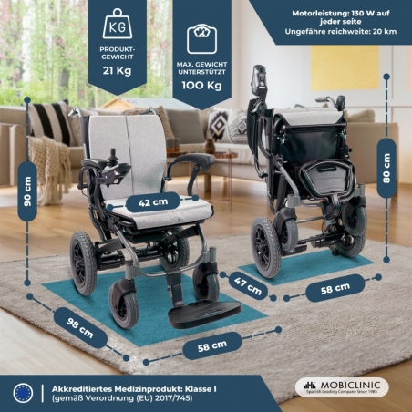 Fortschrittliche Technologie : Der Rollstuhl verfügt über ein Schnellwechsel-Akkufach – ein unverzichtbares Merkmal bei faltbaren Elektrorollstühlen. Der integrierte, per USB aufladbare Scheinwerfer sorgt für gute Sicht. Die Höchstgeschwindigkeit beträgt 6 km/h, die Reichweite 20 km.
