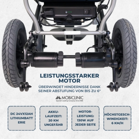 LEISTUNGSSTARKE LEISTUNG : Der Elektrorollstuhl verfügt über einen leistungsstarken 130-W-Motor für ein komfortables Fahrgefühl. Seine elektromagnetische Bremse gewährleistet zuverlässiges Bremsen in verschiedenen Situationen und erhöht so die Sicherheit des Nutzers.
