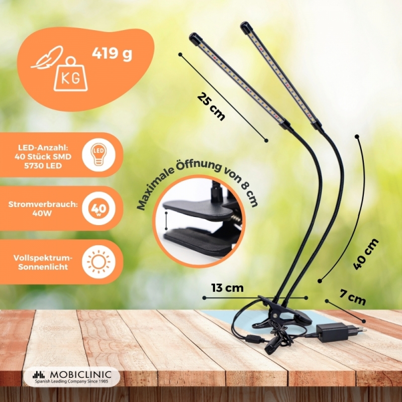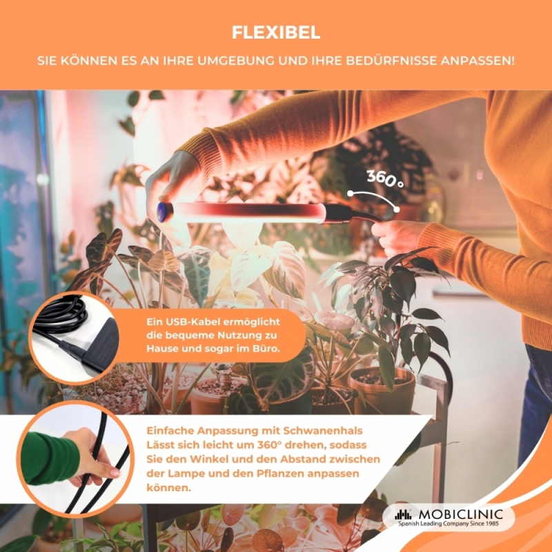 Bei der Pflege Ihrer Pflanzen kommt es auf Flexibilität an. Dank seines 360°-Schwanenhalses, der den Winkel und Abstand zwischen der Lampe und Ihren Pflanzen anpasst. Dank des USB-Kabels ist es bequem und vielseitig einsetzbar.
