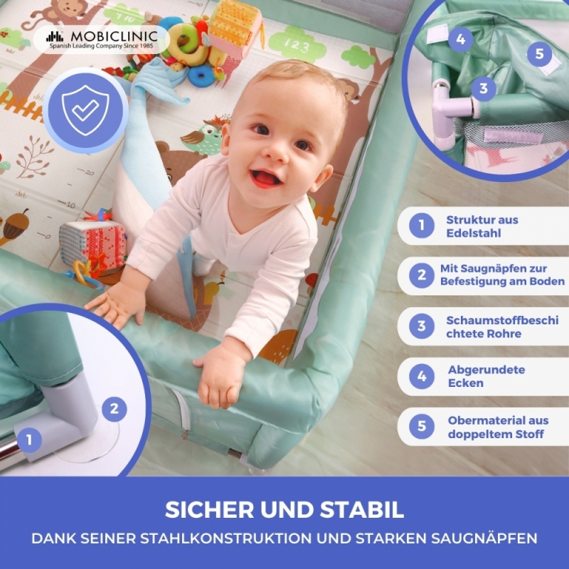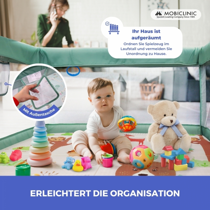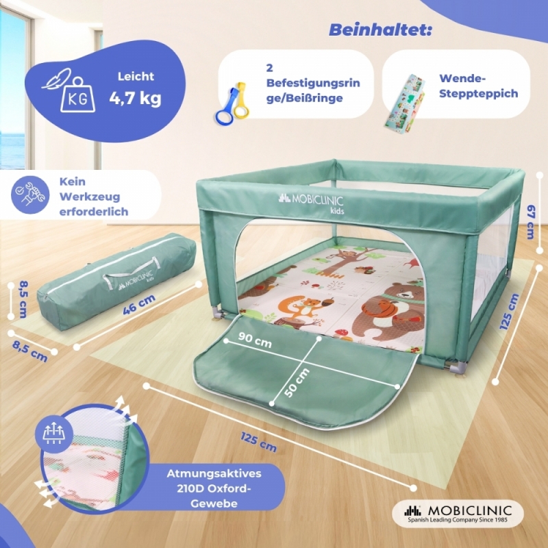 Laufstall mit Teppich | Babys und Kinder | 125x125x67cm | Faltbar | Tragetasche | Grün | Happyland | Mobiclinic