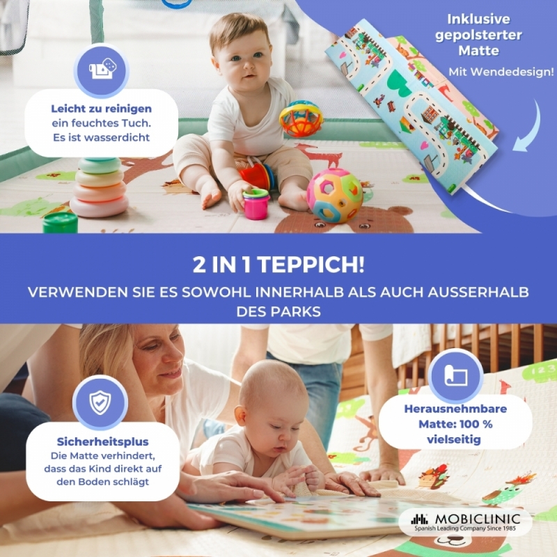 ABNEHMBARE GEPOLSTERTE MATTE: Der Baby-Laufstall verfügt über eine gepolsterte Matte, die Komfort und Schutz bietet. Der Stoff des Teppichs ist reißfest und lässt sich leicht mit einem feuchten Tuch reinigen. Sie können die Matte auch sowohl innerhalb als auch außerhalb des Parks verwenden.