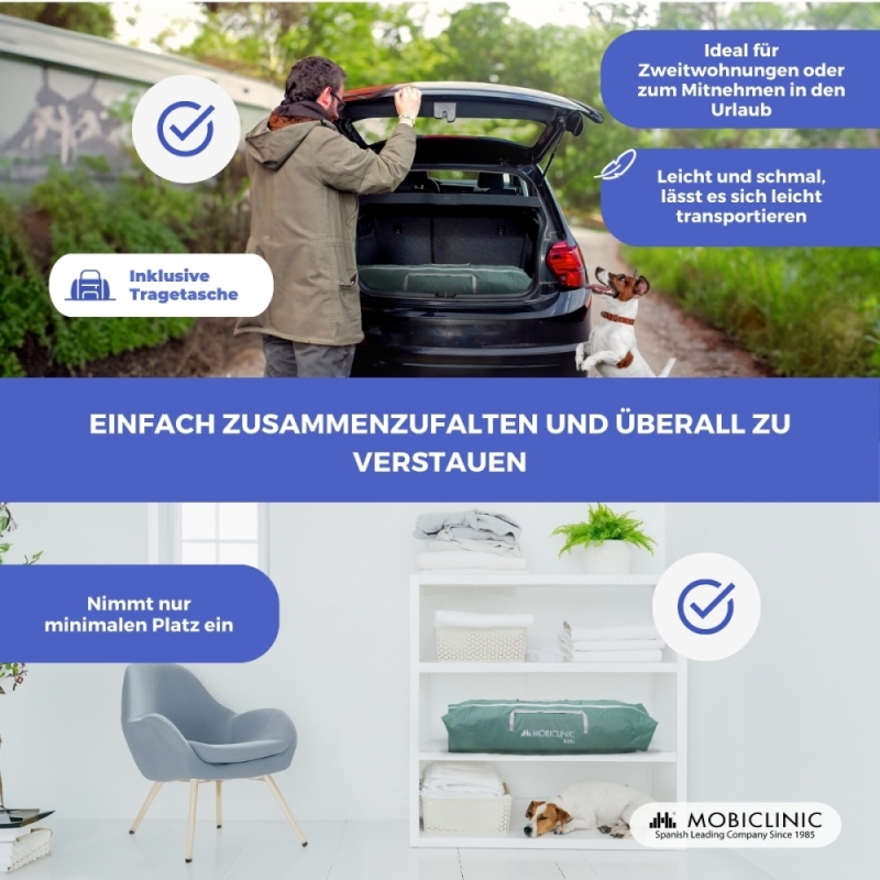 Portabilität ist ein zentraler Aspekt des Designs. Zusammenklappbar und mit einer Tragetasche ausgestattet, kann dieser Laufstall einfach abgebaut und bei Verwandten oder im Urlaub wieder aufgestellt werden. Sein kompaktes Design nimmt weniger Platz ein als Laufgitter aus Kunststoff und erleichtert den Transport.