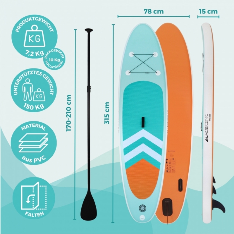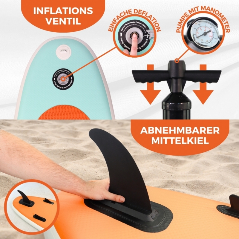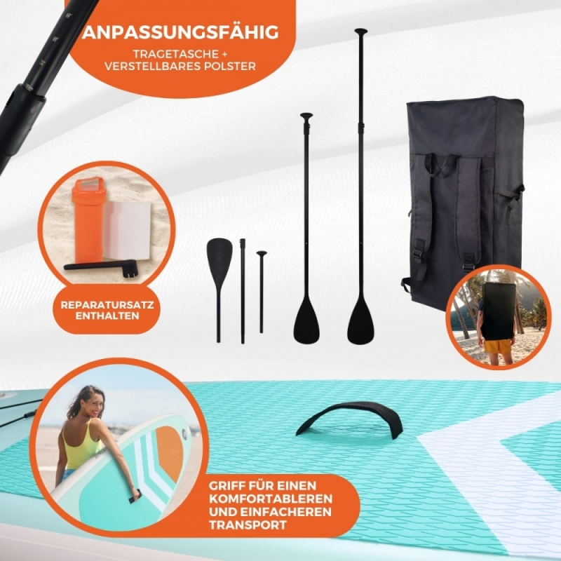 EINFACHER TRANSPORT: Dank des mitgelieferten Rucksacks ist es einfach und problemlos, Ihr Paddle-Surfbrett überall hin mitzunehmen. Leicht und widerstandsfähig ermöglicht es Ihnen, neue Wasserziele zu erkunden, ohne sich Gedanken über den Transport machen zu müssen. Darüber hinaus können Sie ihn im aufgeblasenen Zustand dank des Tragegriffs problemlos transportieren.