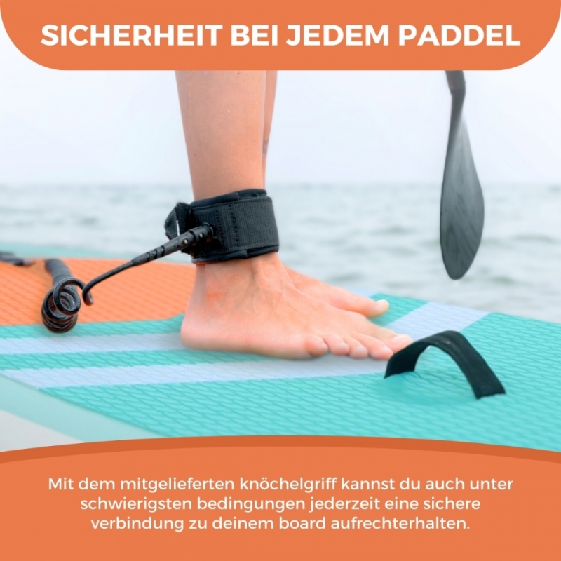 SICHERHEIT BEI JEDEM PASS: Mit dem mitgelieferten Knöchelgriff können Sie auch unter schwierigsten Bedingungen jederzeit eine sichere Verbindung zu Ihrem Board aufrechterhalten. Der Griff sorgt dafür, dass das Board im Falle eines Sturzes oder Umkippens verbunden bleibt, sodass es sich nicht wegbewegen kann und Sie es problemlos bergen können. Diese Funktion sorgt nicht nur für zusätzliche Sicherheit, sondern ermöglicht Ihnen auch, sich auf das Genießen der Landschaft und die Verbesserung Ihrer Technik zu konzentrieren.