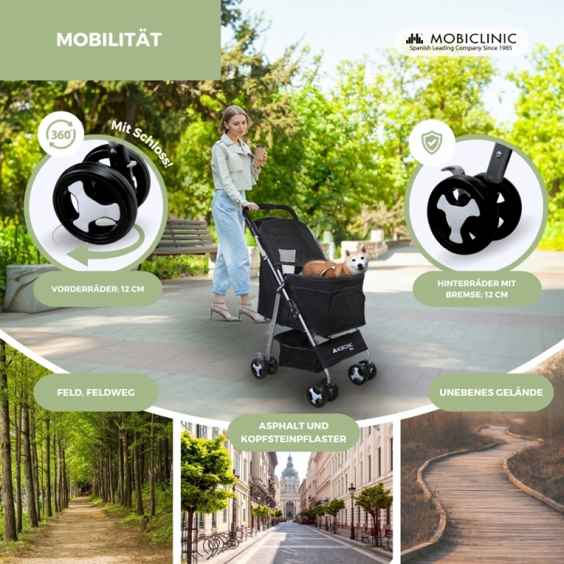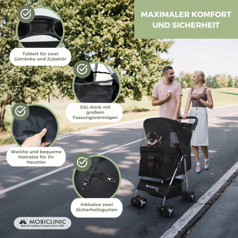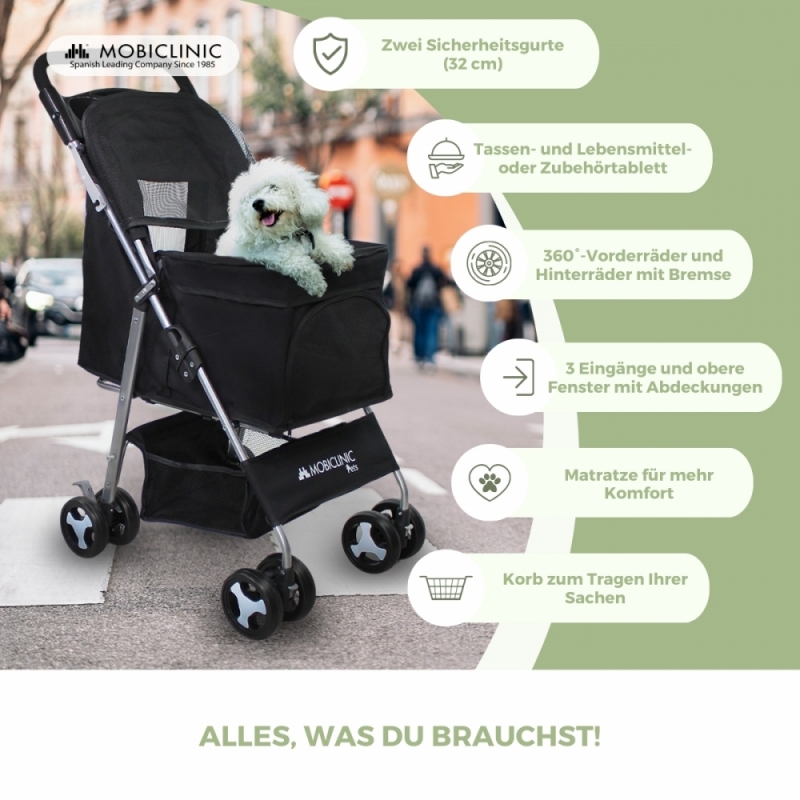 Darüber hinaus hat Sicherheit unbestritten Priorität. Mit vier robusten Rädern, die hinteren mit Bremsen , können Sie sicher sein, dass Ihr Hund während des Spaziergangs vor möglichen Unfällen geschützt ist. Die um 360° drehbaren Vorderräder ermöglichen eine reibungslose und mühelose Bewegung auf unterschiedlichem Gelände, während das 600D-Oxford-Gewebe Beständigkeit gegen Zeitablauf und Dauergebrauch garantiert. Inklusive zwei Sicherheitsgurten.