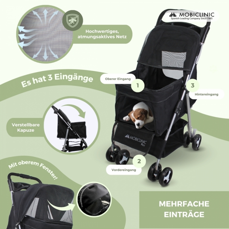 Mit Reißverschlussfenstern können Sie Ihren Hund schnell und einfach in den Kinderwagen hinein- und herausholen, während integrierte Moskitonetze dafür sorgen, dass Ihr Hund während des Spaziergangs gut belüftet und vor lästigen Insekten geschützt ist. Es enthält ein kleines oberes Fenster mit abnehmbarem Deckel.