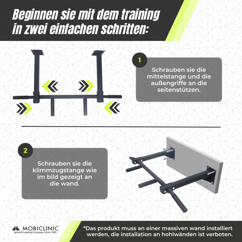 Das mitgelieferte Montageset ermöglicht die individuelle Höhenverstellung der Stange und passt sie so an unterschiedliche Bedürfnisse und Übungsarten an. Dank der kompakten und robusten Bauweise lässt sie sich problemlos an jeder Wand in Ihrem Zuhause anbringen.