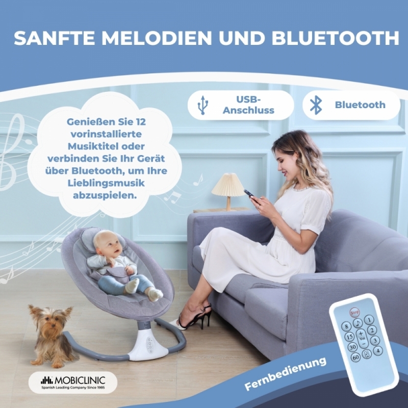 Praktische Funktionen für Eltern: Die Hängematte verfügt über eine Fernbedienung, mit der Sie die Einstellungen ganz einfach anpassen können, ohne aufstehen zu müssen. Eltern können die Schaukelgeschwindigkeit steuern, Musik abspielen oder den Timer aus der Ferne aktivieren, was besonders praktisch ist, wenn das Baby bereits schläft oder die Eltern mit anderen Aufgaben beschäftigt sind.