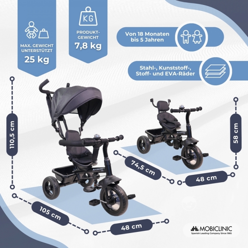 Mit den Maßen 111 x 104 x 48 cm und einem Gewicht von 7,5 kg ist dieses Dreirad widerstandsfähig und gleichzeitig leicht zu handhaben. Dieses Produkt trägt ein maximales Gewicht von 25 kg pro Benutzer.