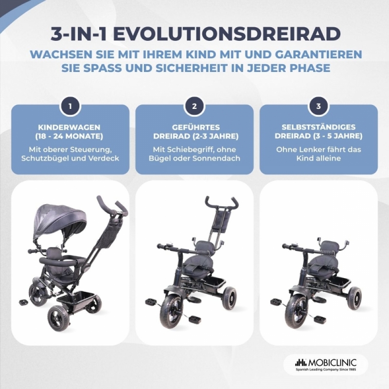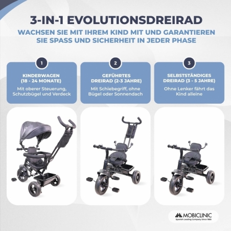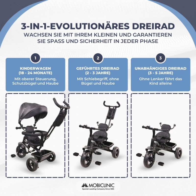 3 IN 1 EVOLUTIONÄRES DREIRAD : Dieses Dreirad passt seine Nutzung an die Entwicklung der Fähigkeiten unserer Kleinen an. Von der elterlichen Kontrolle bis hin zum autonomen Element von Spaß und Unterhaltung. Konzipiert für Kinder von 18 Monaten bis 5 Jahren mit einem Maximalgewicht von 25 kg.