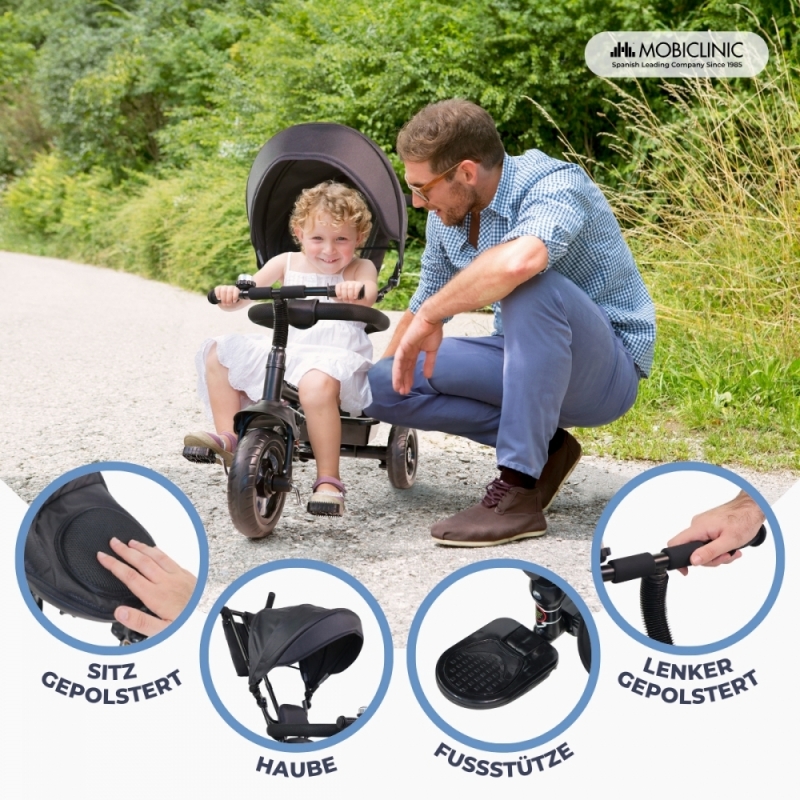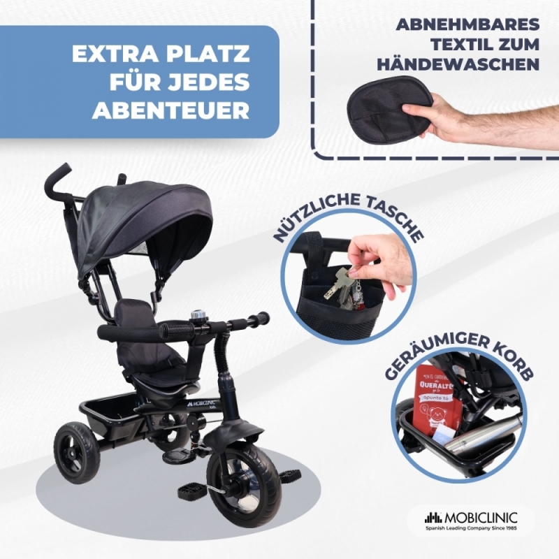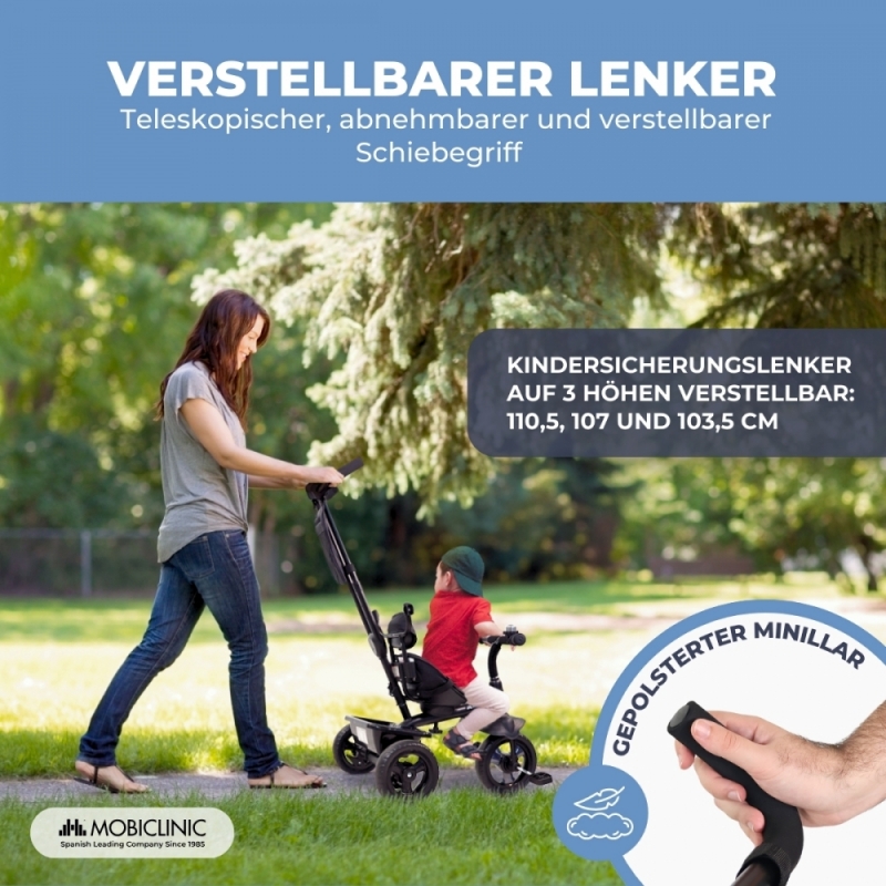 Dieses Dreirad ist so konzipiert, dass es sowohl Kindern als auch Eltern ein komfortables und praktisches Erlebnis bietet, was es zu einer hervorragenden Option für den täglichen Gebrauch macht. Es verfügt über einen gepolsterten Sitz und eine gepolsterte Rückenlehne, die den Komfort der Kleinen garantieren, ein verstellbares Verdeck, um sie vor Sonne und Wind zu schützen, und einen Stauraum mit einem unteren Korb zum Transport von Spielzeug, Rucksäcken oder anderen Gegenständen, die während des Spaziergangs benötigt werden eine Tasche im oberen Griff zur Aufbewahrung kleinerer Gegenstände. Dieses doppelte Aufbewahrungssystem macht es Eltern leicht, alles zu transportieren, was sie brauchen, ohne zusätzliche Gegenstände mit sich herumtragen zu müssen. Der Schiebegriff ist in 3 Höhen verstellbar: 111 cm – 107,5 cm – 105 cm, was den Eltern mehr Komfort bietet.