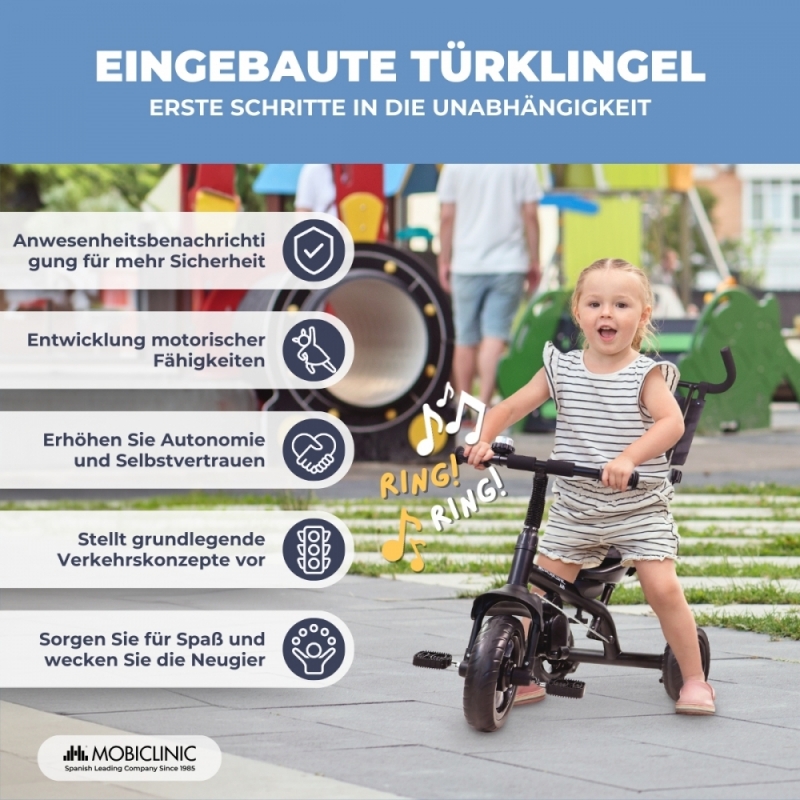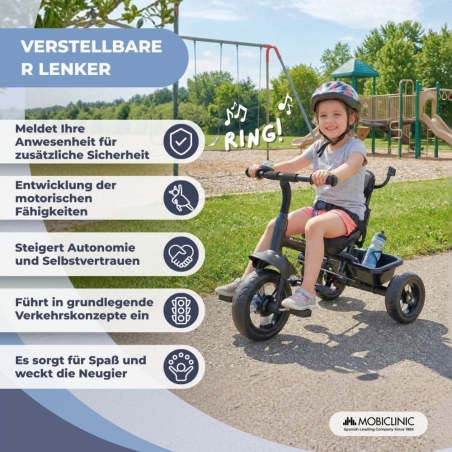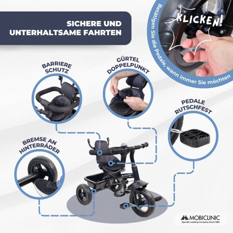 SICHER : Das Dreirad verfügt über einen Sicherheitsgurt und eine Schutzbarriere. Darüber hinaus verfügt es über eine Bremse am Hinterrad und einen Kupplungsknopf, der es dem Kind ermöglicht, die Pedale zu benutzen, ohne das Rad zu bewegen, was für mehr Sicherheit sorgt. Die EVA-Verbundreifen können sowohl innerhalb als auch außerhalb der Stadt verwendet werden und bieten eine sanfte und leise Fahrt.