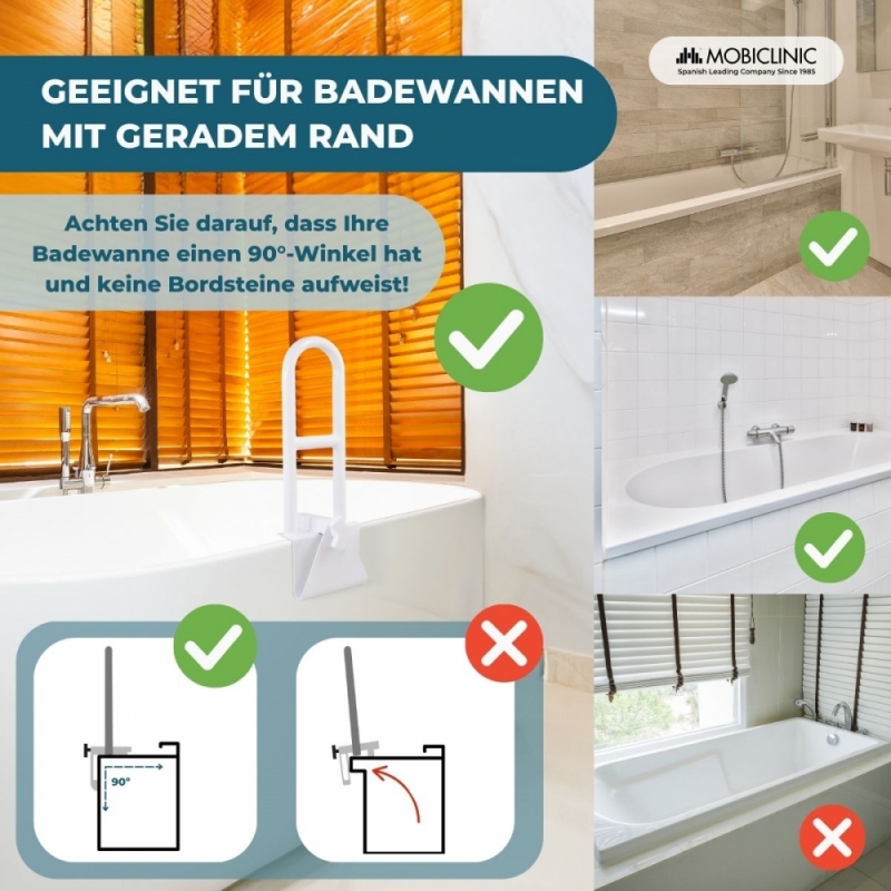 Es passt auf Badewannen mit glatten, flachen Kanten und einer Breite von mindestens 4,5 cm bis maximal 13,5 cm und ist somit für verschiedene Badewannenmodelle geeignet. Der ergonomische Griff ermöglicht einen festen und sicheren Halt, auch mit nassen Händen. Es zeichnet sich vor allem durch seine robuste Konstruktion aus, ist bis zu 100 kg belastbar und eignet sich sowohl für den klinischen als auch für den privaten Gebrauch.