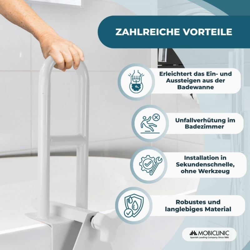SICHERHEIT UND AUTONOMIE: Dieser Badewannengriff bietet festen und stabilen Halt und reduziert so das Risiko von Stürzen oder Rutschen. Er gibt dem Benutzer Sicherheit und Unabhängigkeit bei der Hygiene und sorgt für Komfort und Wohlbefinden.