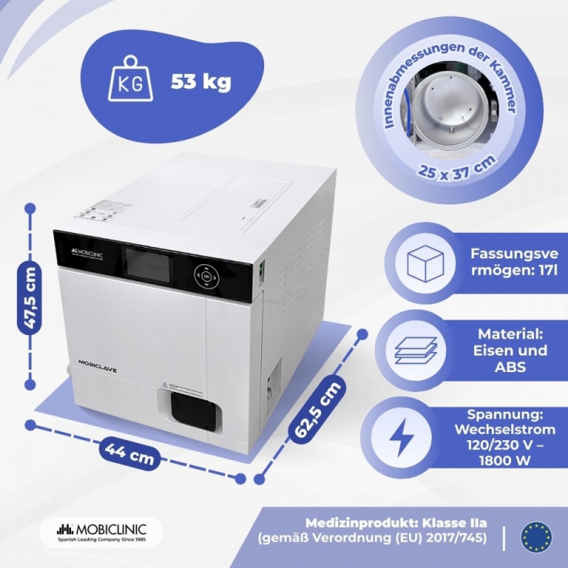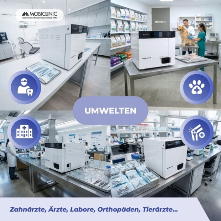 Der 17-Liter-Sterilisationsautoklav Mobiclinic ist für eine vollständige, professionelle und sichere Sterilisation konzipiert und erfüllt die Anforderungen verschiedener Branchen wie Zahnkliniken, medizinische Zentren, Labore, Orthopädiepraxen oder Tierkliniken.
