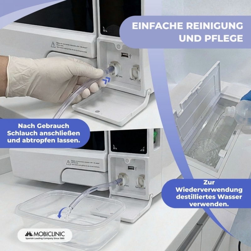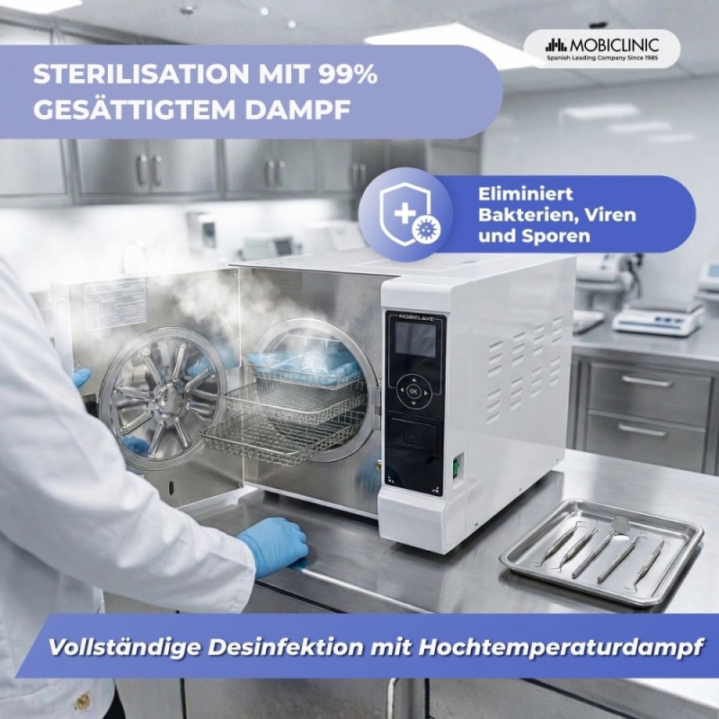 Der Sterilisationsautoklav Mobiclinic mit 8 Litern Fassungsvermögen ist eine professionelle Lösung für die vollständige, effektive und sichere Sterilisation und eignet sich für alle Arten klinischer Umgebungen. Er nutzt 99 % gesättigten Dampf zur Inaktivierung von Bakterien, Viren, Pilzen und Sporen und gewährleistet so einen zuverlässigen Reinigungsprozess selbst unter anspruchsvollsten Bedingungen.