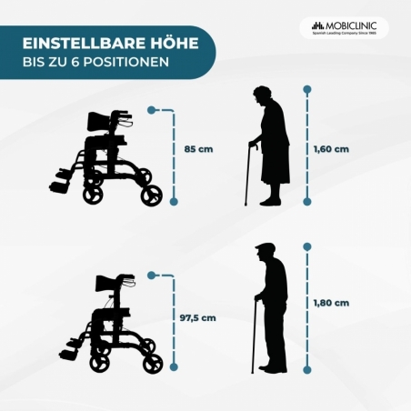 Der Rollator Ibiza Mobiclinic mit Fußstütze ist eine Gehhilfe, die Sicherheit, Komfort und Praktikabilität im Alltag bietet. Dank des 6-fach verstellbaren Höhenverstellsystems (84,6–97,3 cm) passt er sich verschiedenen Nutzern an, fördert eine korrekte Körperhaltung und reduziert die Ermüdung beim Gehen.
