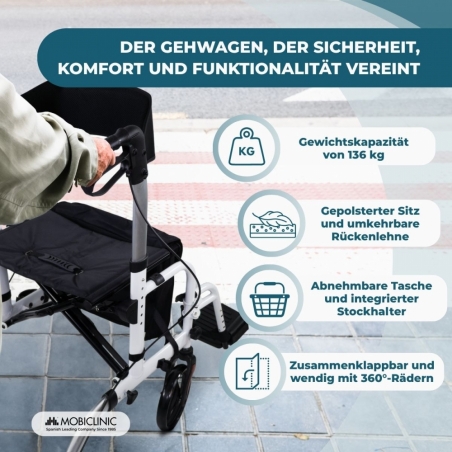 Als zusätzliches Plus beinhaltet es eine abnehmbare Einkaufstasche aus strapazierfähigem Oxford-Gewebe, die sich perfekt zum Transportieren von Habseligkeiten eignet, sowie eine integrierte Gehstockhalterung , die den Alltag noch einfacher macht.