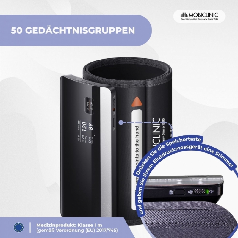 Sprachassistent: Eine Sprachführung erklärt den gesamten Messvorgang Schritt für Schritt. Diese Funktion erleichtert die Bedienung, insbesondere für Senioren oder Menschen mit Sehbehinderung, da sie die Handhabung intuitiver gestaltet. Die Funktion ist nur in Englisch und Spanisch verfügbar.