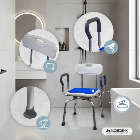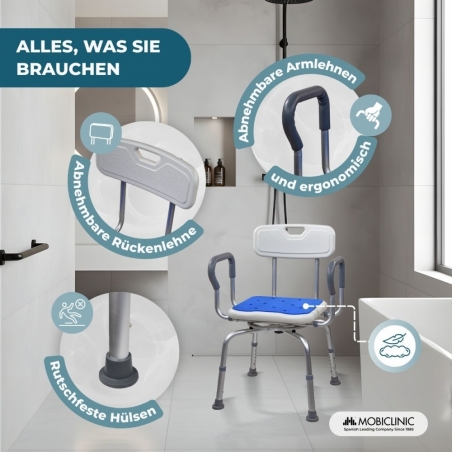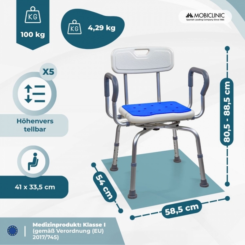 Der drehbare Badhocker Akila bietet Komfort und Sicherheit beim Duschen und bei der Körperpflege und ist ideal für Senioren, Rehabilitationspatienten oder Menschen mit eingeschränkter Mobilität. Dank des drehbaren Sitzes sind flüssige und sichere Bewegungen ohne Verdrehen des Oberkörpers möglich, wodurch das Risiko von Stürzen und Verletzungen reduziert wird. Ein integriertes Sicherheitsverriegelungssystem verhindert ungewollte Bewegungen und sorgt für zusätzliche Stabilität während der Benutzung.