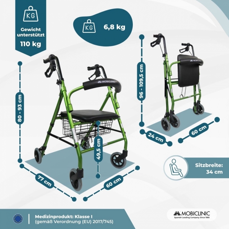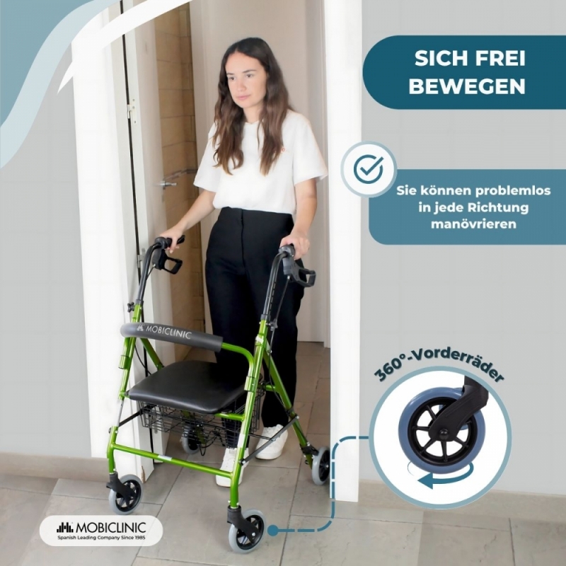 Es handelt sich um einen Rollator mit innovativem und leichtem Design. Die Gehhilfe bietet hervorragende Stabilität, dabei wird ihre Mobilität gefördert. Dieser Rollator ist aus Aluminium gefertigt und bietet eine hohe Widerstandsfähigkeit bei leichtem Gewicht. Er vereint den optimalen Kompromiss zwischen Stabilität und Mobilität. Seine vier soliden Räder sind so konstruiert, dass sie kleine Hindernisse auf dem Boden, sowie kleinere Steine problemlos überwinden, ohne dass die Gefahr besteht, dass die Reifen beschädigt werden.