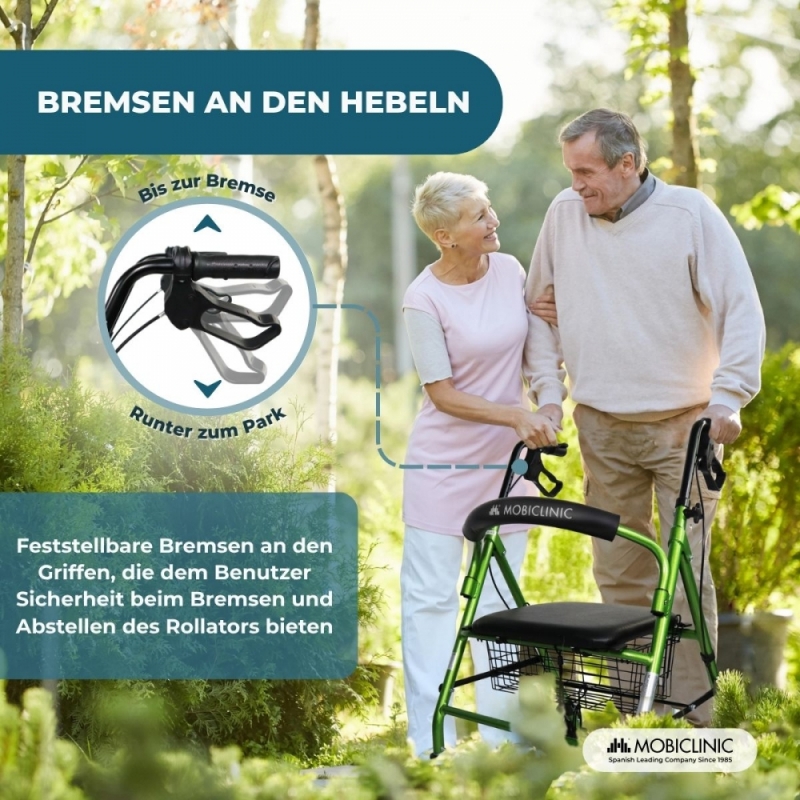 Die Griffe der Gehhilfe sind ergonomisch geformt und tragen dazu bei, das Gewicht des Nutzers zu verteilen und abzufedern. Darüber hinaus verfügt der Rollator über leicht zu betätigende Bremsen, um die Gehhilfe im gewünschten Moment und mit geringem Kraftaufwand anzuhalten. Die Bremsen können außerdem festgestellt werden, um den Rollator z. B. während des Sitzens zu fixieren. Wenn die Gehhilfe vollständig blockiert werden soll, ziehen Sie einfach die Bremsgriffe nach unten und die Räder werden fixiert.