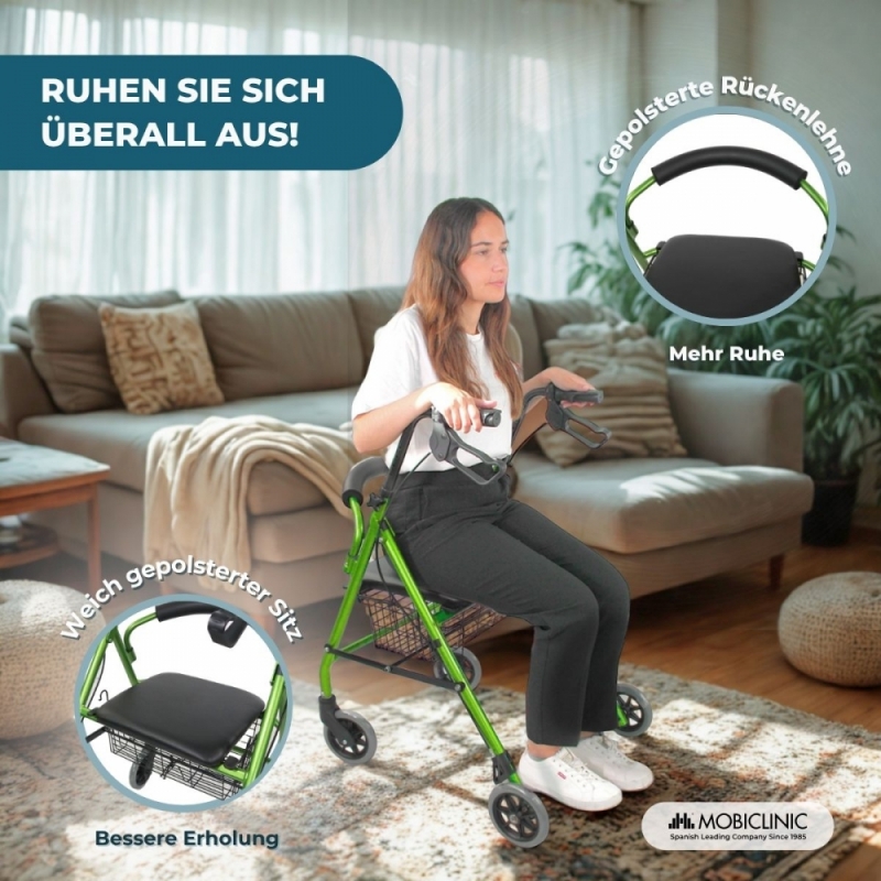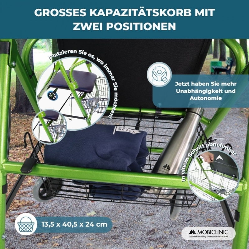 Diese Gehhilfe aus Aluminium verfügt über einen gepolsterten Sitz sowie eine gepolsterte Rückenlehne, beides sorgt für Komfort und Sicherheit und erweist sich als sehr nützlich, um sich bei langen Spaziergängen ausreichende Erholung zu ermöglichen. Der Rollator enthält einen Korb, in dem Sie Ihre Habseligkeiten sicher und bequem aufbewahren können, während Sie gehen. Er kann entweder unter dem Sitz oder an der Vorderseite der Gehhilfe angebracht werden.