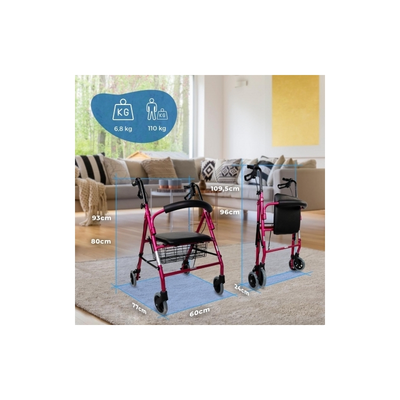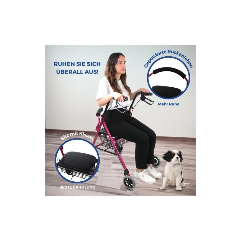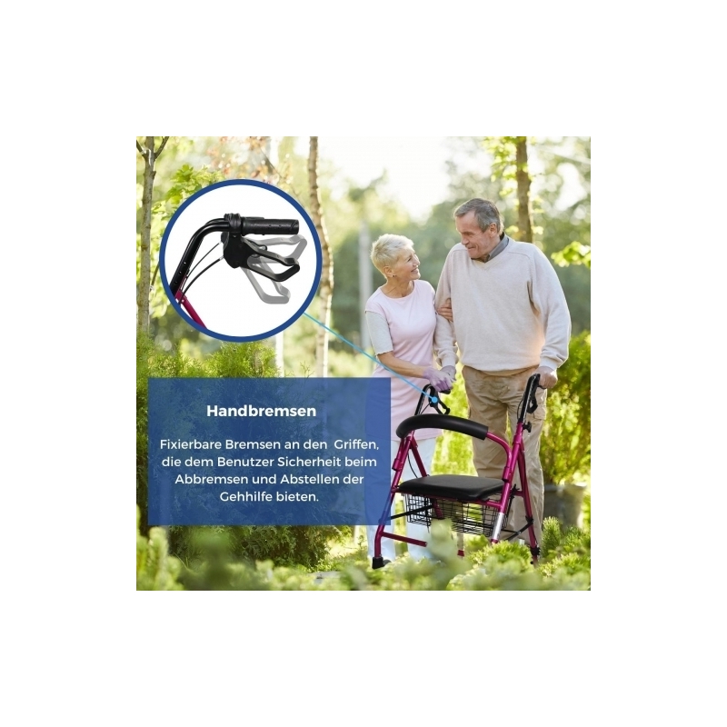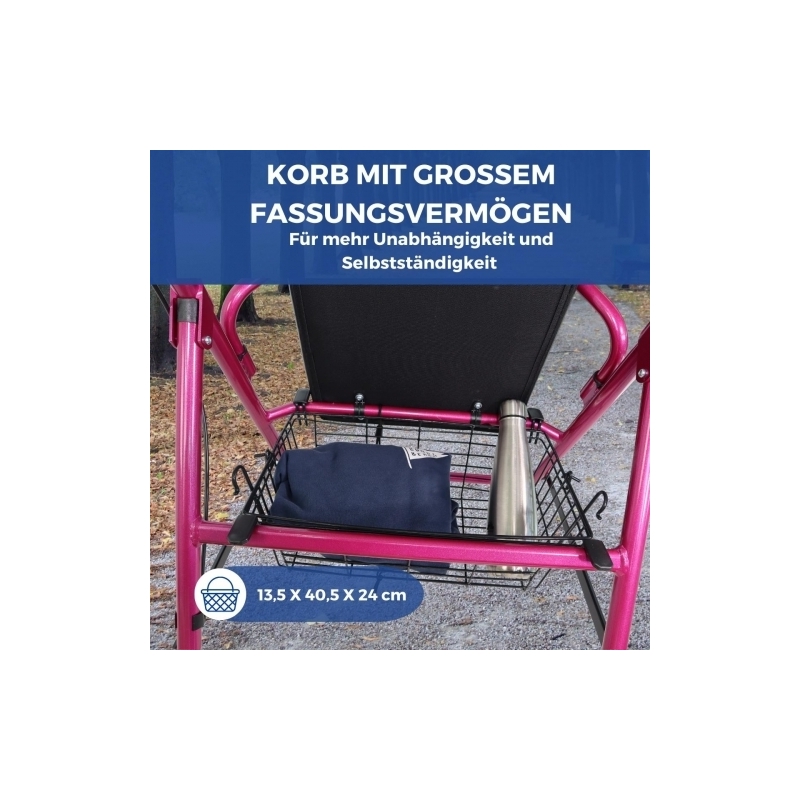 Dieser Aluminium-Gehwagen verfügt über einen gepolsterten Sitz und eine gepolsterte Rückenlehne, um Komfort und Sicherheit sowie ausreichend Ruhe nach der Anstrengung zu gewährleisten. Im Lieferumfang ist ein Korb enthalten, in dem Sie Ihre Sachen beim Gehen sicher und bequem verstauen können. Sie können es sowohl unter dem Sitz als auch vorne am Gehwagen platzieren.