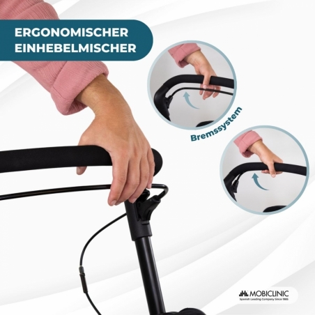 Für Sicherheit sorgt die Feststellbremse , die den Rollator bei Bedarf an Ort und Stelle hält, sei es beim Kochen, Sprechen oder Anhalten auf der Straße.