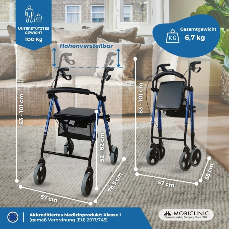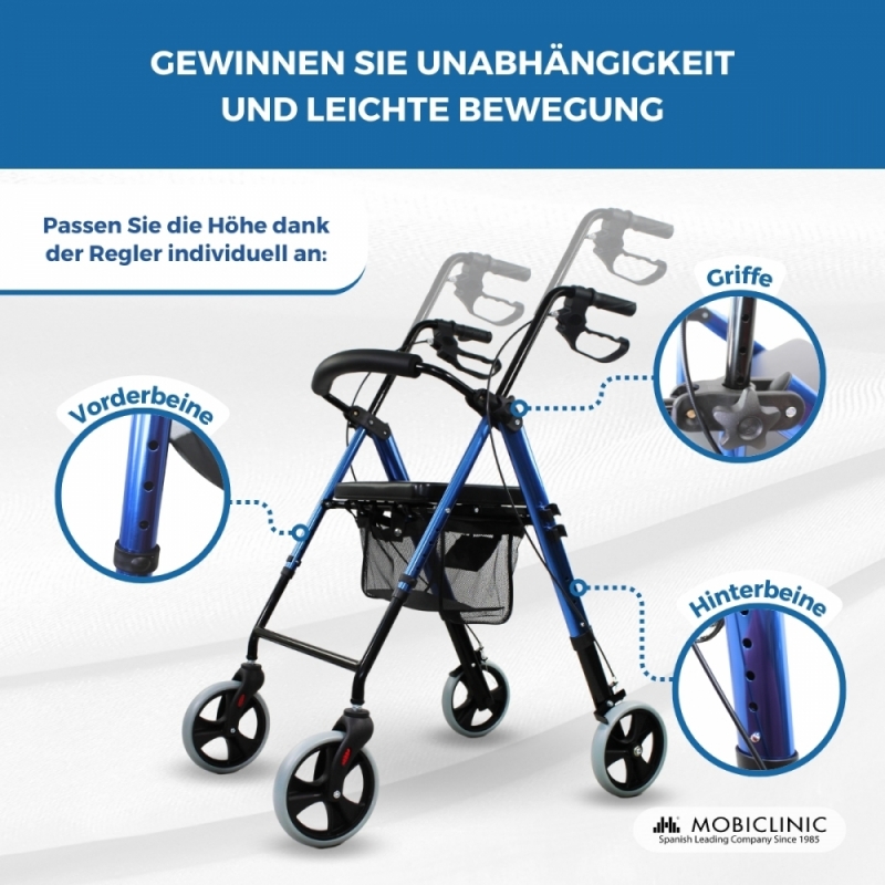 Aus Aluminium gefertigt, ist dieser Leichtgewicht-Rollator sehr robust und stabil, aber zugleich auch sehr leicht. Er wiegt nur 6,7 kg, was sowohl die Nutzung, als auch das Zusammenklappen und den Transport vereinfacht. Darüber hinaus können Sie die Höhe der Griffe gemäß Ihrer persönlichen Wünsche einstellen.