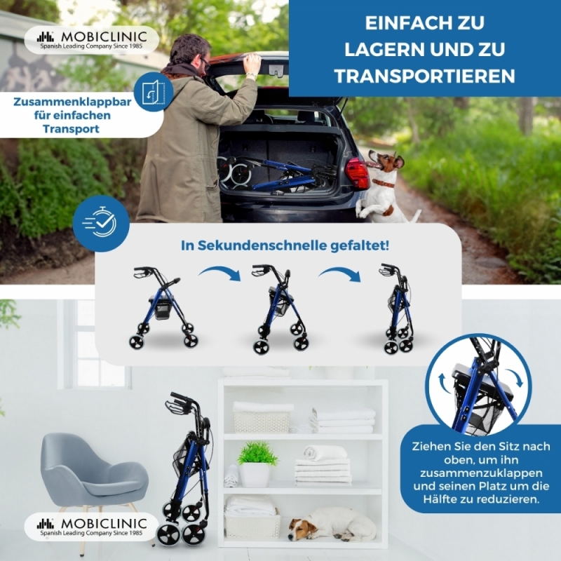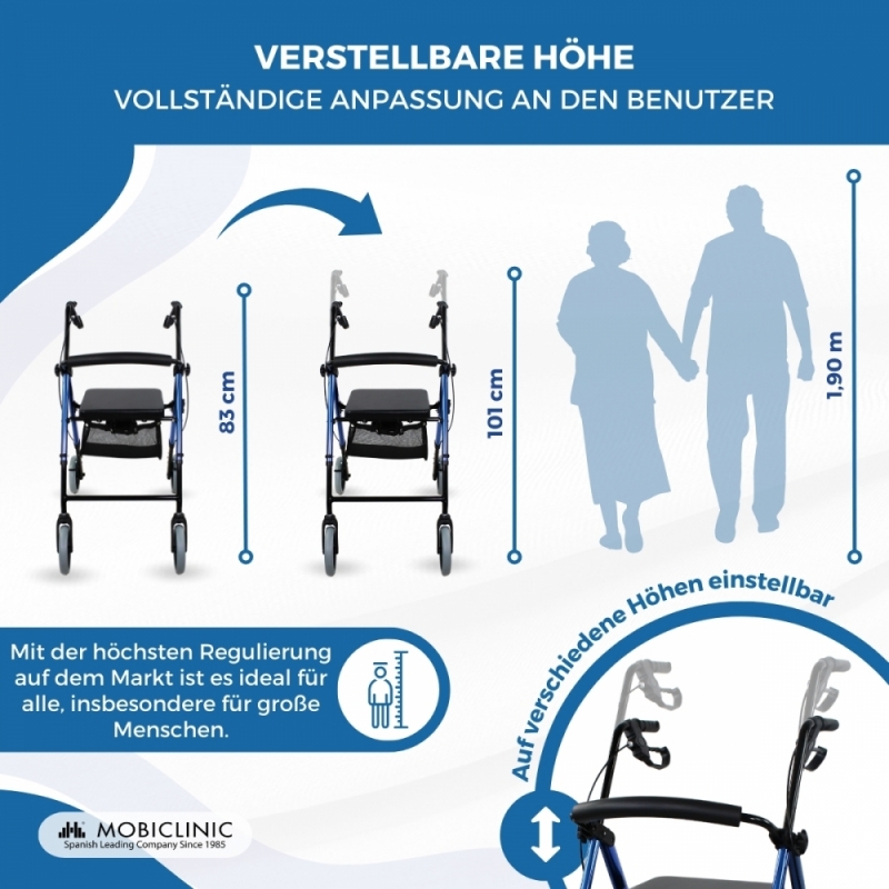 HÖHENVERSTELLBAR UND ZUSAMMENKLAPPBAR: Dieser 4-Rad-Rollator ermöglicht die Einstellung der Höhe, um ihn an die Bedürfnisse des Nutzers anzupassen (von 83 bis 101 cm). Außerdem lässt er sich leicht zusammenklappen, um ihn im Kofferraum zu transportieren oder platzsparend zu verstauen.