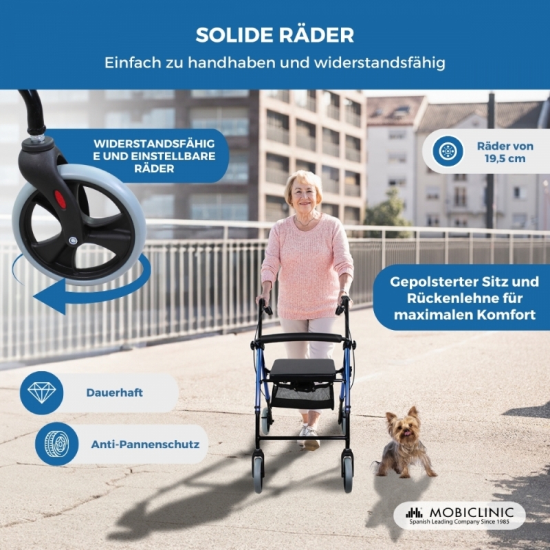 Mit diesem Outdoor Rollator können Sie sich zu Hause und auf der Straße sorgenfrei bewegen. Dank seiner vier pannensicheren Räder mit einem Durchmesser von 20 cm, die mit reflektierenden Bändern ausgestattet sind, sind Sie auch bei Nacht gut sichtbar. Er ist sowohl als Rollator für die Wohnung als für die Benutzung auf ebenen Straßen geeignet.