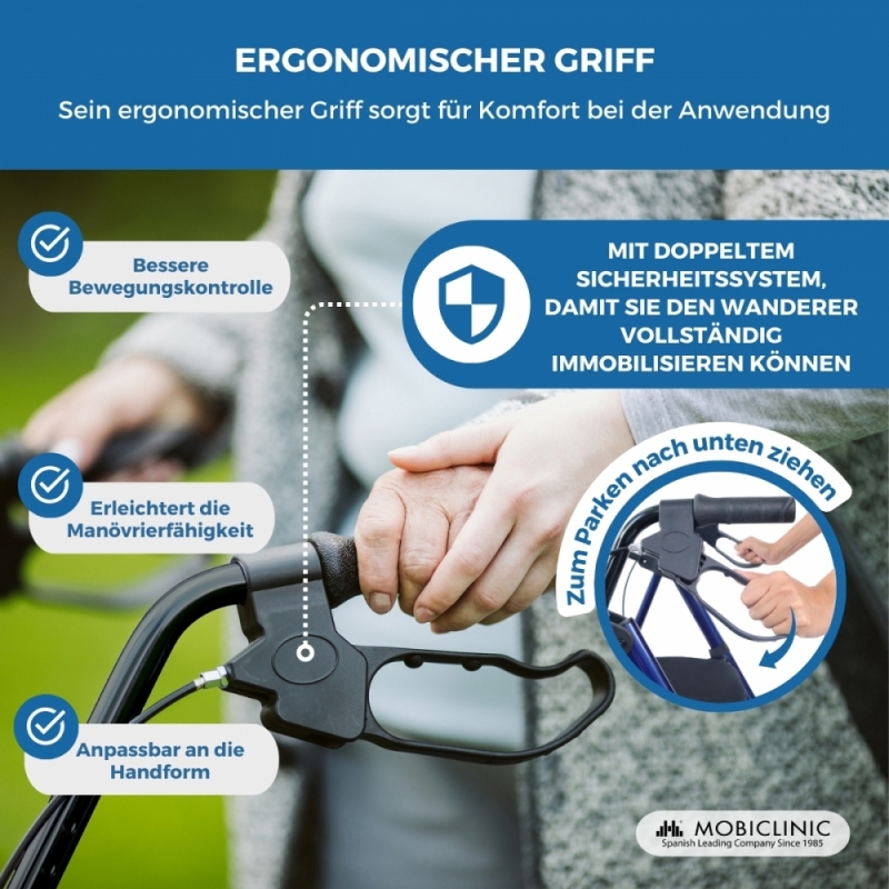 Diese Art von Gehwagen mit Sitz ist perfekt für Menschen mit Bewegungseinschränkungen, da diese Gehhilfe ihnen die nötige Stabilität und Sicherheit bietet. Die Bremsen des Modells Hercules befinden sich leicht zu erreichend an den Handgriffen.