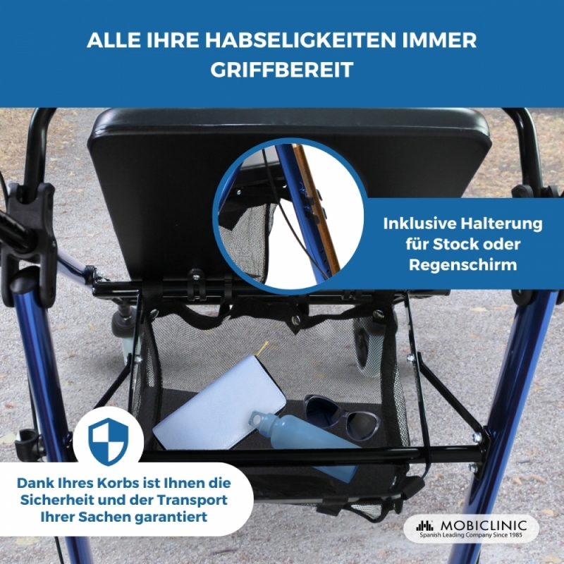 Der Alu-Rollator hat außerdem eine große Tasche unter dem Sitz, in der Sie praktischerweise alle Einkäufe oder persönliche Gegenstände transportieren können und so immer zur Hand haben.