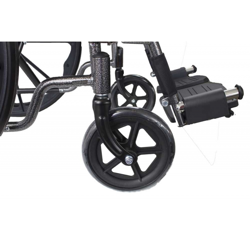 Die Reiserollstühle haben ein elegantes Design mit anthrazitfarbenem Gestell, Nylonpolsterung und einer Tasche in der Rückenlehne, in der persönliche Gegenstände verstaut werden können. Er hat einen breiten und bequemen Sitz mit einer Tragfähigkeit von bis zu 110 kg - verstellbare Fußstützen, die an die Körpergröße des Benutzers angepasst werden können und leicht abnehmbar sind.